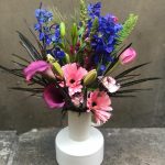 זר גבוה ומרשים, משלב ירק ארכיטקטוני עם פרחים יוקרתיים כדלפיניום גיאנט, לוע הארי, ורדים סגולים. מפאת גודלו מומלץ לשדך לו אגרטל זכוכית קלאסי