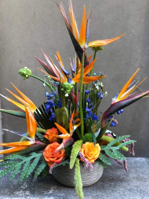 סידור טרופי בצבעים בוהקים ופרחים וירק בעלי איכות ארכיטקטונית: ציפור גן העדן בכתום לוהט, דלפיניום סגול, נץ החלב לבן, זנבות שועל ירוקים. עלי שרך ודקל ממסגרים את הכל באלגנטיות